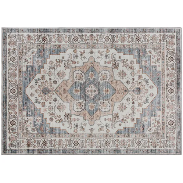 Vintage Machine Washable Rug, Non-Slip Carpet for Living Room, Bedroom, Dining Room, Brown & Light Blue